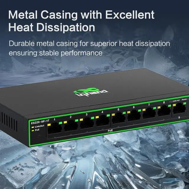Simplicity: As an unmanaged switch, the ES220-8P-1T requires no configuration. Its plug-and-play functionality helps users quickly and easily expand their network, reducing reliance on specialized technical skills. ^^ Robust & Fanless