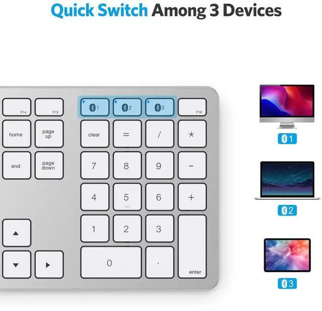 STABLE CONNECTION & EASY SWITCH TO THREE DEVICES: MacBook keyboard provides a stable connection at a range of 33ft/ 10m, offering three independent Bluetooth channels, this iMac keyboard supports up to three devices simultaneously and easily switch between them by pressing Fn + Bluetooth button