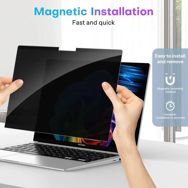 Magnetic Design, Quick Installation The innovative magnetic design eliminates the need for tedious adhesive application, and says goodbye to bubbles and glue stains. Simply attach the included magnetic strip to the top frame of your laptop screen, ensuring it aligns with the black magnetic strip on the privacy screen for a secure fit. Installation and removal takes just a second, allowing you to seamlessly switch between private and shared modes.