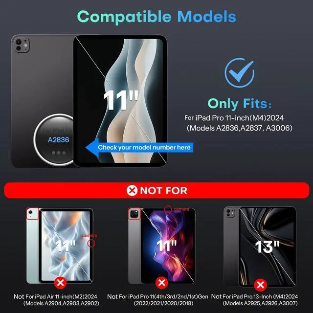 Check Your Tablet Model FirstMagnetic Keyboard case is compatible with iPad Pro 11-inch 2024 M4 (Model No.: A2837, A2836, A3006) Note: The model number Axxxx is on the back of the iPad