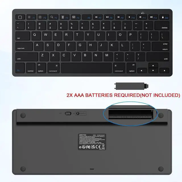 (NOTICE: The function keys not fully compatible with other system) ^^ Reasonable Layout. QWERTY Layout with Hot keys Customized for iPads, Including Volume, Music Control, Brightness etc. ^^ Long Battery Life2 x AAA Battery Required, NOT Included, The keyboard uses an energy-saving design and automatic sleep mode to allow up to 6 months between battery changes ^^