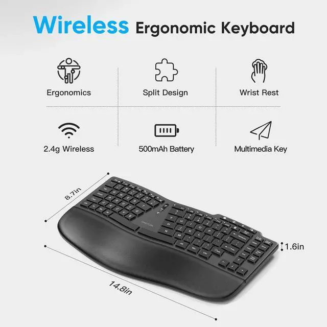 Ergonomic Split Keyboard: The split design of this wireless Keyboard provide a more natural and comfortable typing position, eliminating tension and fatigue in the wrists, forearms and shoulders during prolonged use. Ideal for use in the office or at home ^^ More