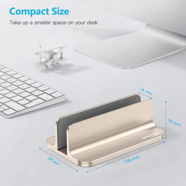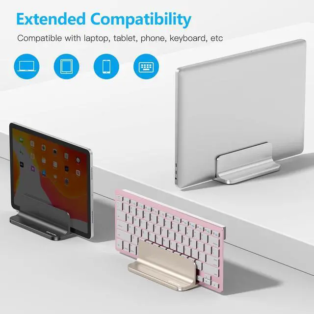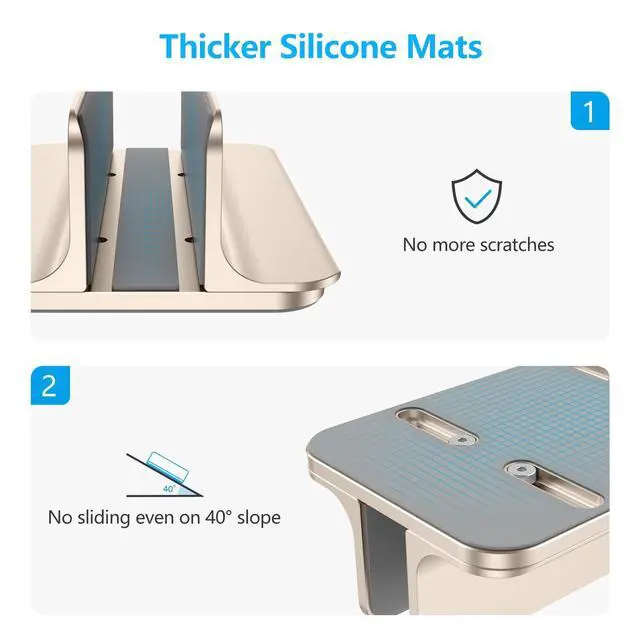 Optimize Desktop Space - It cradles your laptop or notebook vertically and keeps your desktop well-organized and space-efficient. ^^ Adjustable Size - Its adjustable width enables compatibility with most laptop or notebook brands with thickness ranging between 0.55 in x 14mm to 2.71 in x 69mm. ^^ Exquisite Workmanship - Its sandblasted, brushed, and CNC-machined from anodized aluminum alloy. ^^ Durable and Stable - Its anodized aluminum alloy is scratch resistant, and its wide base guarantees stability and prevents falls. ^^ Protective Mat - Non-slip silicone mats cover the laptop docks to avoid scratches and to keep devices stable.