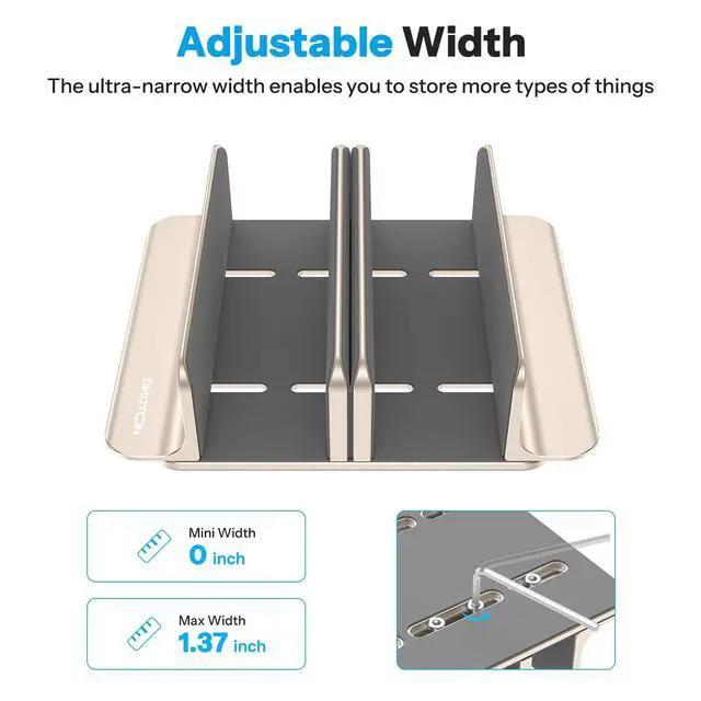 THREE-SLOTS ADJUSTABLE SIZE: Our upgrad this vertical laptop stand into 3 slots for more functional use. Its adjustable width enables compatibility with most laptop or notebook brands with thickness ranging between 0.55 in x 14mm to 2.71 in x 69mm.