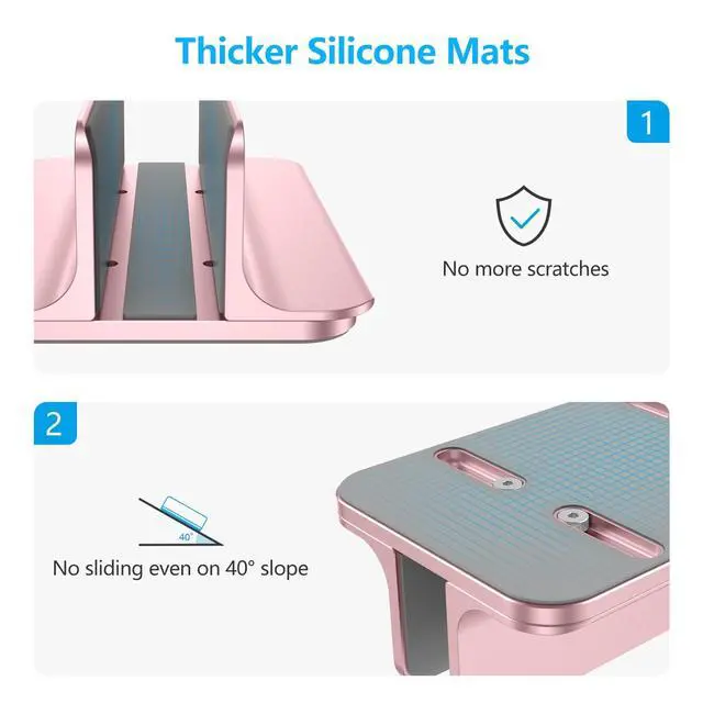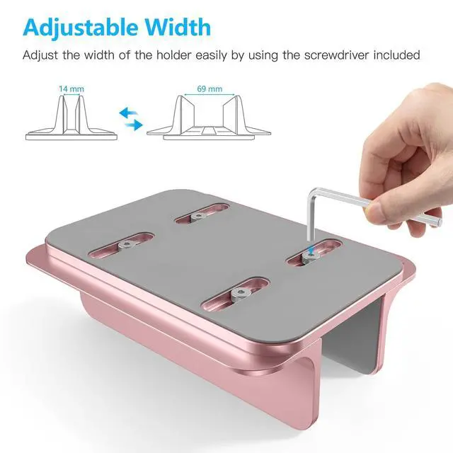Optimize Desktop Space - It cradles your laptop or notebook vertically and keeps your desktop well-organized and space-efficient. ^^ Adjustable Size - Its adjustable width enables compatibility with most laptop or notebook brands with thickness ranging between 0.55 in x 14mm to 2.71 in x 69mm. ^^ Exquisite Workmanship - Its sandblasted, brushed, and CNC-machined from anodized aluminum alloy. ^^ Durable and Stable - Its anodized aluminum alloy is scratch resistant, and its wide base guarantees stability and prevents falls. ^^ Protective Mat - Non-slip silicone mats cover the laptop docks to avoid scratches and to keep devices stable.
