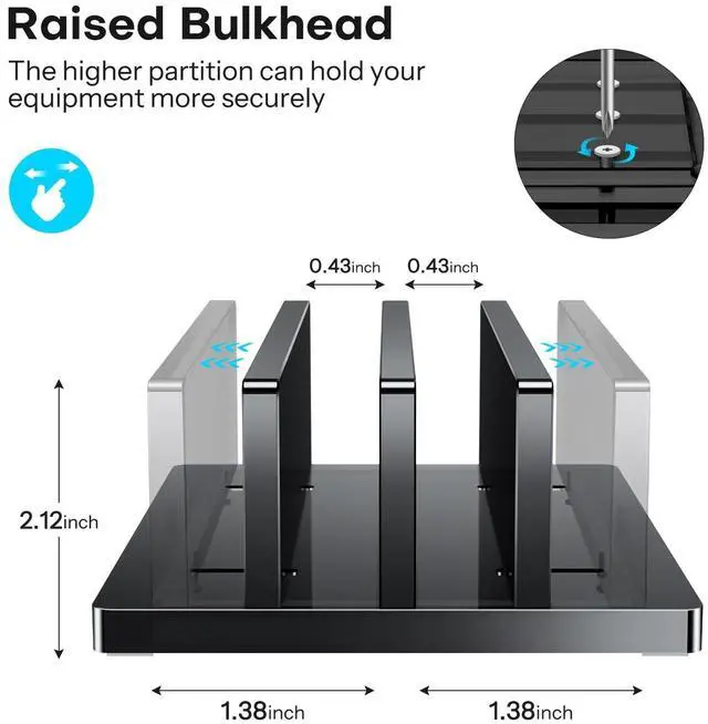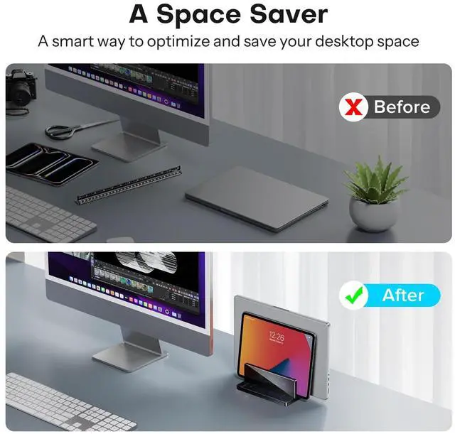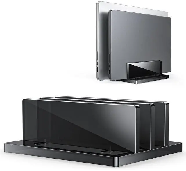 Dual Docks Design: This vertical laptop stand features double slots that not only accommodate two devices but also help keep the desk organized. You can adjust it from 0.43 to 1.38 to ensure a secure fit for devices of various sizes ^^