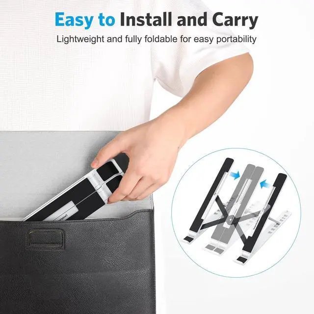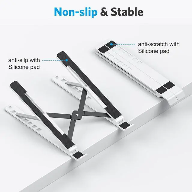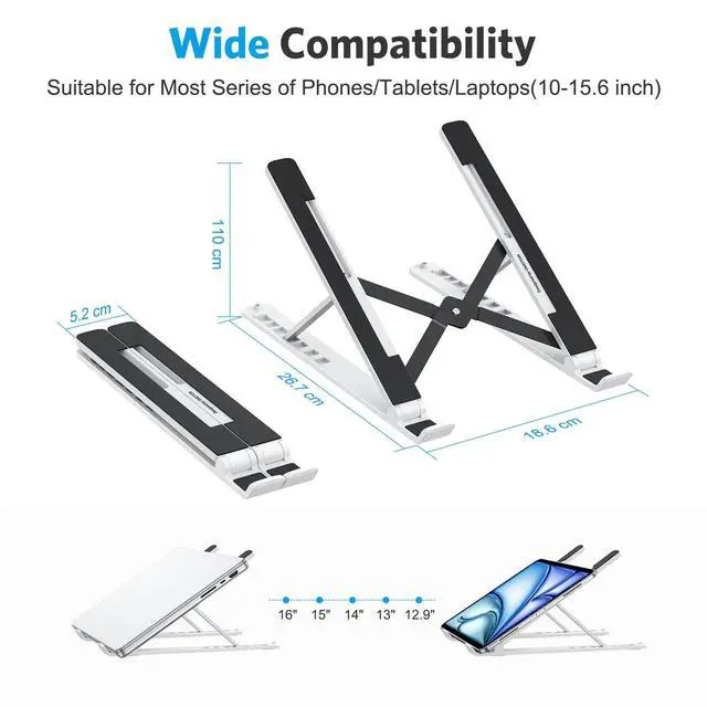 Height Adjustment: This laptop riser features a ergonomic design, which can be adjusted to seven different heights to meet your various needs. It lessens neck aches while enabling you to work at your preferred vantage point. ^^ Broad CompatibilityOur laptop stand is compatible with all laptops and iPads from 10" to 15.6", such as MacBook Air/Pro, Chromebook, Microsoft Surface, Dell, HP, Acer laptops, all tablets, eBooks, etc.