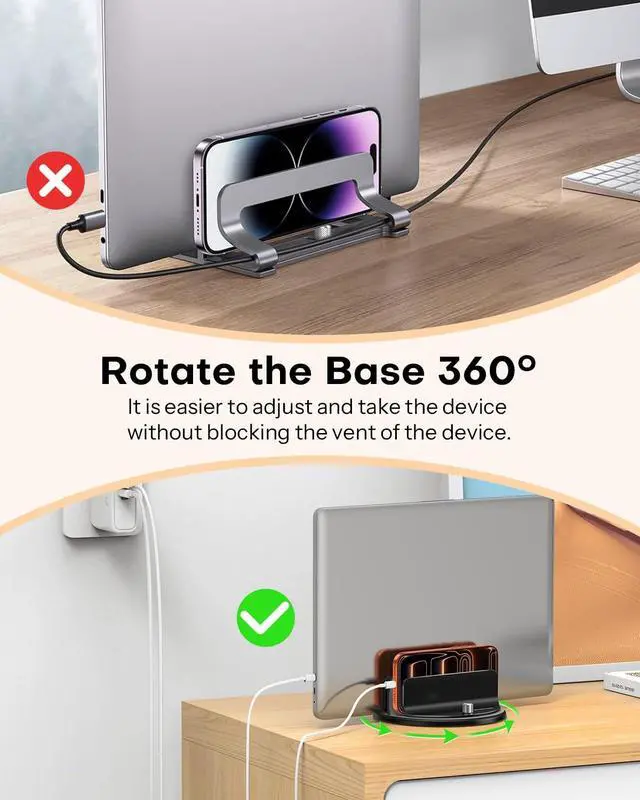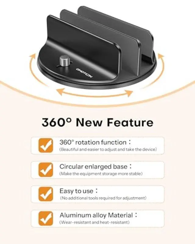 360 Rotating Base DesignIn your personal workspace, a simple spin brings any device front and center no lifting or rearranging needed. Whether you're using a laptop or a ipad, this feature ensures seamless access. In shared areas, just rotate the stand toward whoever needs it. The 360 design keeps your workflow smooth and your space collaboration-ready. ^^ Tool-Free Width AdjustmentGet the perfect fit for any device instantly. Unlike fixed stands that require disassembly, this MacBook stand features captive screws on both sides that you can rotate by hand to adjust the slot widthno tools needed.