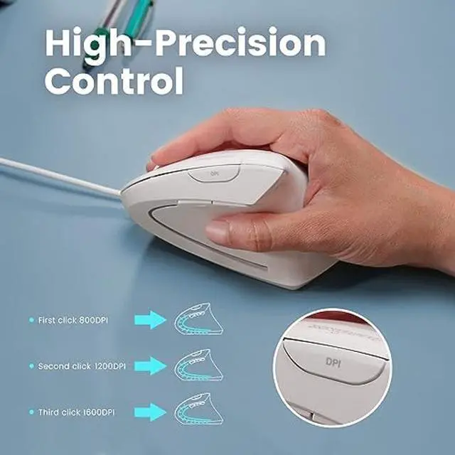 Perixx PERIMICE-513W Wired Ergonomic USB Mouse - 6 Buttons with 1000/1600 DPI - Vertical Right-Handed Design - White