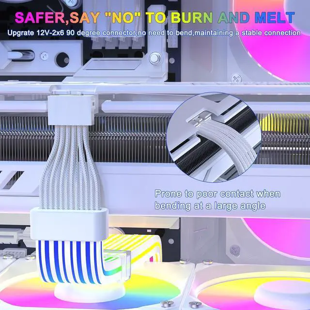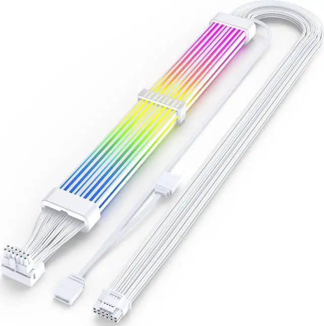 Its space-saving 90-degree connector design ensures a seamless fit in cases with limited space, while the enhanced safety features provide a reliable and secure connection. Made from premium materials such as TPE flexible material and a 16AWG thickened alloy copper core, the Sirlyr 12VHPWR RGB power supply cables delivers exceptional durability and heat dissipation. Its all-white exterior design complements any theme, especially white-themed glass panel cases, adding a touch of sophistication and enhancing your system's aesthetics. Upgrade your PC's lighting system and unleash the full potential of your graphics card with the Sirlyr 12VHPWR RGB PC Cable.