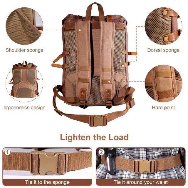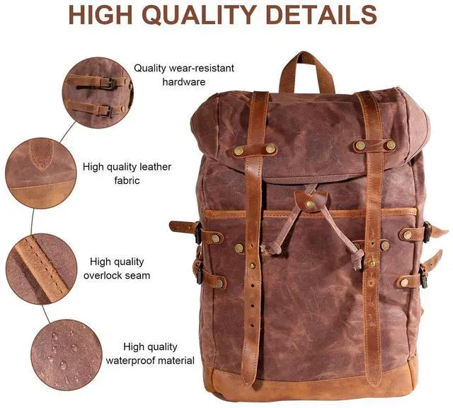 Premium Quality Material: This backpack is made of waterproof durable canvas and top quality genuine crazy horse leather trim. The premium quality ensure the long lasting durability. The high density canvas is made of pure cotton, it's strong, hard-wearing, scratch-resistant. The crazy horse leather is made of high-end top layer cowhide material, with a thickness of 2.5mm, which is solid and durable, and the quality solid hardware won't gather rust easily.