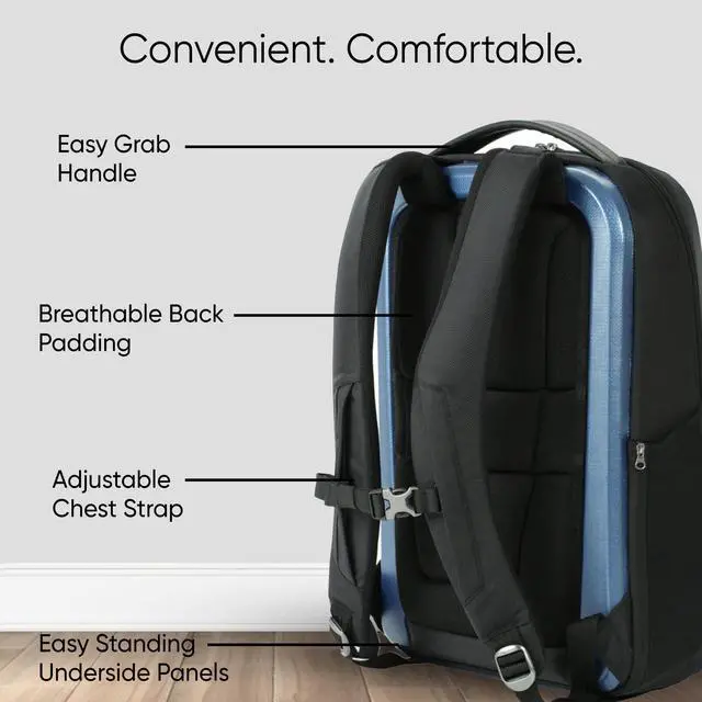 Comfortable Carrying: Equipped with breathable back padding, adjustable chest straps, and an integrated luggage handle sleeve for enhanced comfort and convenience.