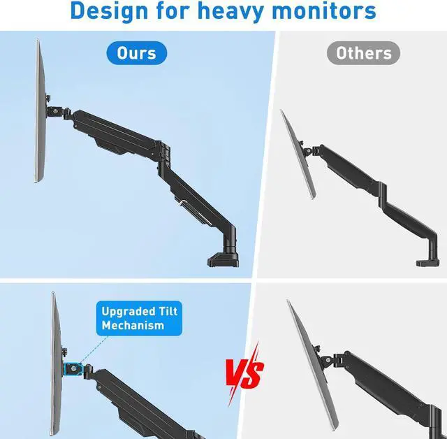Innovation Tilting Head Design - The design of the two limit screws effectively prevents monitor heading down problem and keep it stay in vertically. Internal gas spring has undergone over 20,000 fatigue tests to ensure the arm is strong and durable