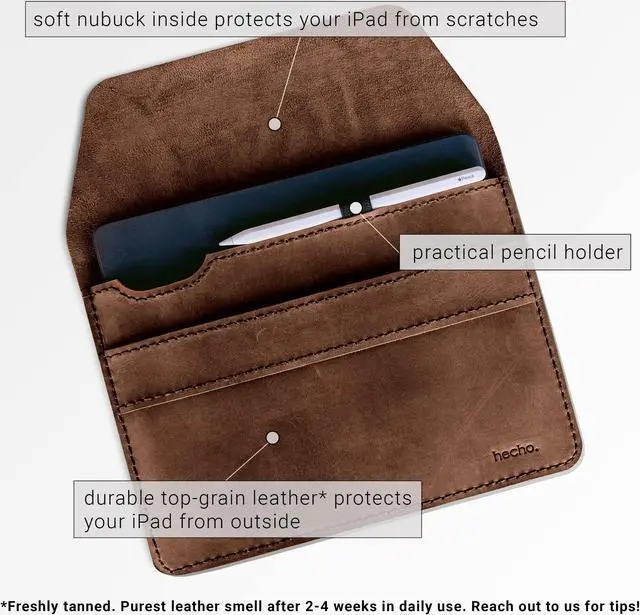 The surface is oiled and slightly nubucked. Through contact with hands, air and sun, the iPad sleeve develops a special patina over time, which makes the color tones shine even darker and stronger. Each tablet case thus becomes a unique, long-lasting, one of a kind companion.