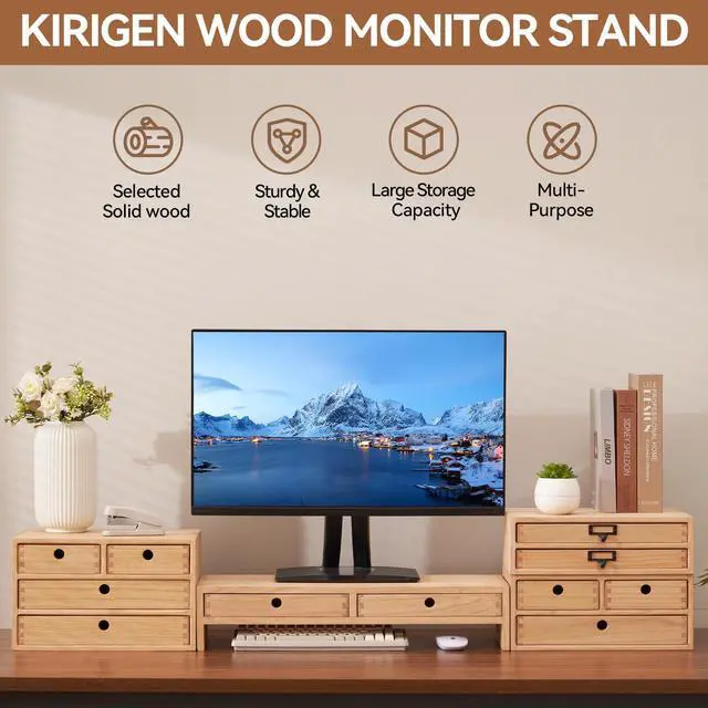 KIRIGEN Wood Monitor Stand with 2 Drawers - Computer Arm Riser Desk Storage Organizer,Speaker TV Laptop Printer Stand with Pen Slot and Cable Management,2-Tier Desktop Shelf NA-2PMJ