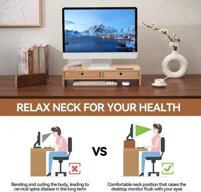 ERGONOMIC DESIGN :The ergonomic computer monitor stand (Measuring 4.92" in height) to keep your screen at a comfortable eye-level height, effectively improve posture to relieve eyestrain and prevent back & neck pain throughout the workdays.