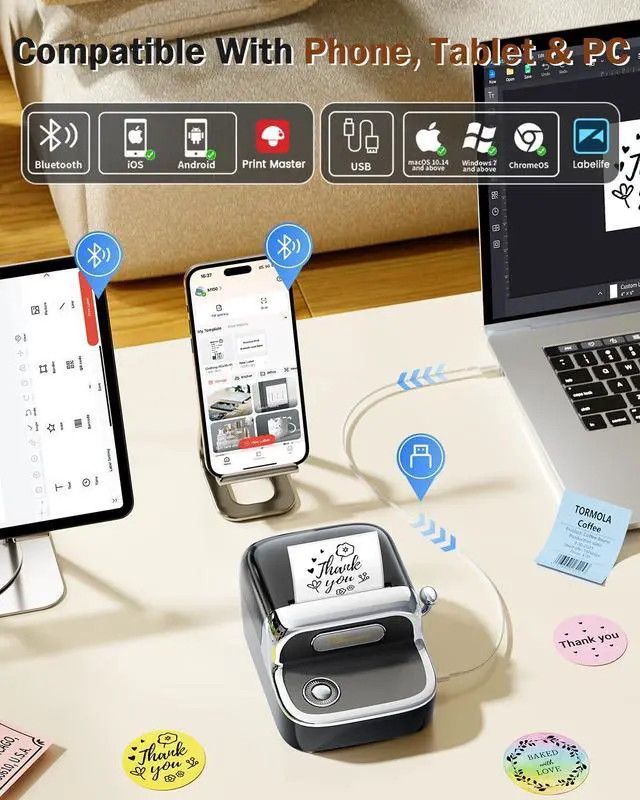 Easy Connection: Phomemo M150 wireless label maker works with all devices from iOS, Android devices (phones, tablets) and Windows, macOS, or Linux devices (PCs, laptops). Just download the "Print Master" app and pair it via Bluetooth. For PC, go to Phomemo official website