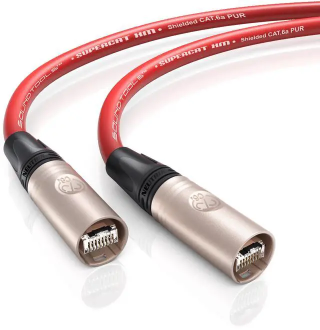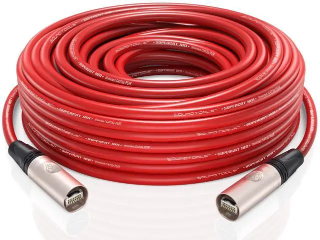 The SoundTools SuperCAT XM etherCON to etherCON Cat6A Grade S/FTP Shielded Cable is a Festival Grade flexible windable Cat6A shielded cable designed to ensure superior data integrity over extended distances. This cable is tailored for high bandwidth digital and analog signals such as AES3, Dante, AVB, Madi, and analog over Cat. SoundTools assures that the SuperCAT XM can reliably transmit AES50 over distances of up to 110 meters, all while sporting an eye-catching SoundTools red color.