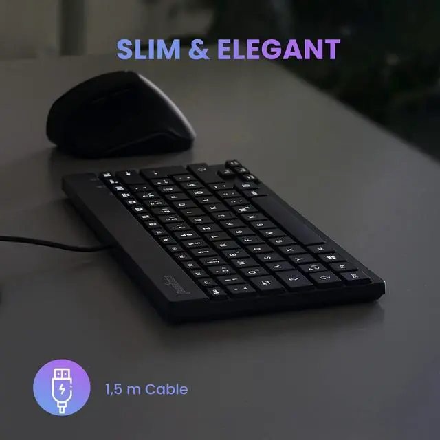 COMPACT DESIGN: Mini keyboard without the number pad area to make more space on your desk and less distance from the keyboard to your mouse (Dimension: 10.87 x 5.43 x 0.55 inches; Weight: 0.84 lb)