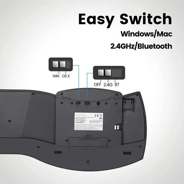 WIRELESS 2. 4 GHZ AND BLUETOOTH CONNECTION: Switch between two connection options at the bottom of the keyboard; nano receiver is stored safely in the compartment at the bottom of the keyboard
