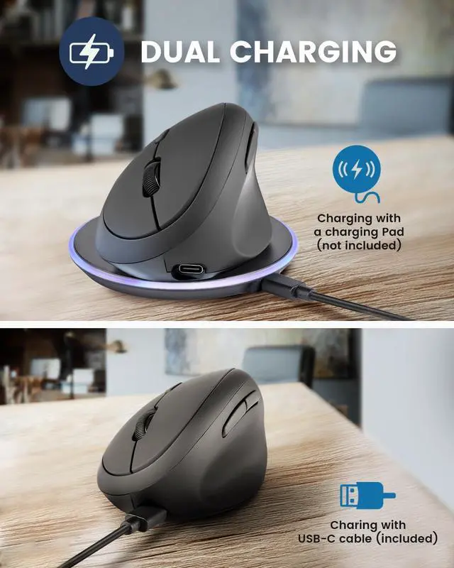 DUAL RECHARGEABLE OPTIONS - Experience ultimate convenience with dual charging capabilities. The Perixx PERIMICE-719R offers both wired charging via a USB-C connection and wireless charging for added flexibility (wireless charger included). The package also includes a USB-C to A cable for easy wired charging.
