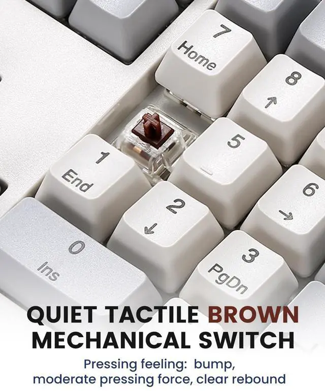 Dimensions: 17.95 x 6.65 x 1.34 inches ^^ MECHANICAL DESIGN - Keys Gateron brown tactile switch create a good feedback for the use in the office or at home. ^^ ERGONOMIC SA SPHERICAL KEYCAPS - Curved key design with a flatter top and back edges of each key that naturally fits better with the shape of your fingertips for exceptionally comfortable typing feeling; The keys are removable and easy to clean ^^ LONG KEY STRUCTURE - Comfortable and responsive keys with long travel distance and satisfying auditory feedback ^^ SYSTEM REQUIREMENTS - Windows 7, 8, 10, and 11, one free USB port;