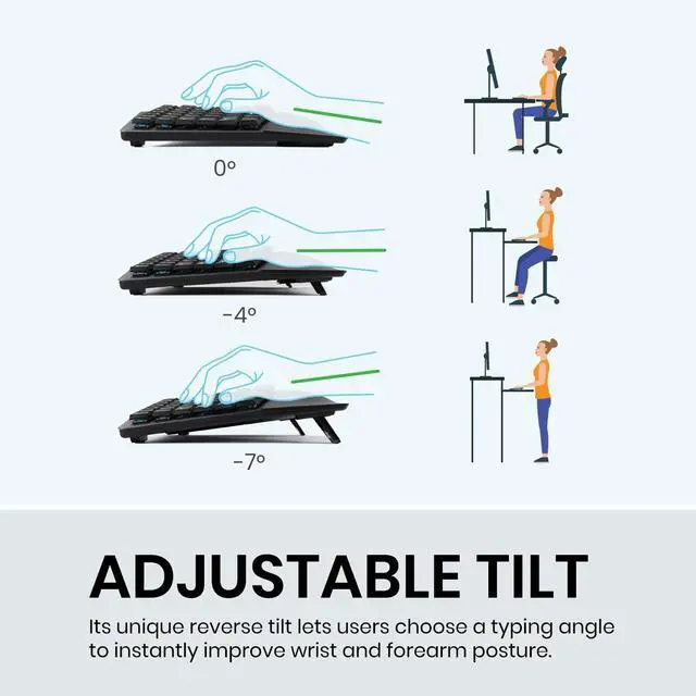 Tilt Wrist Rest: The integrated palm rest supports the palm and wrist while correcting the wrist pronation while typing to prevent unwanted pressure and muscle strains with 0, -4, and -7 degrees.