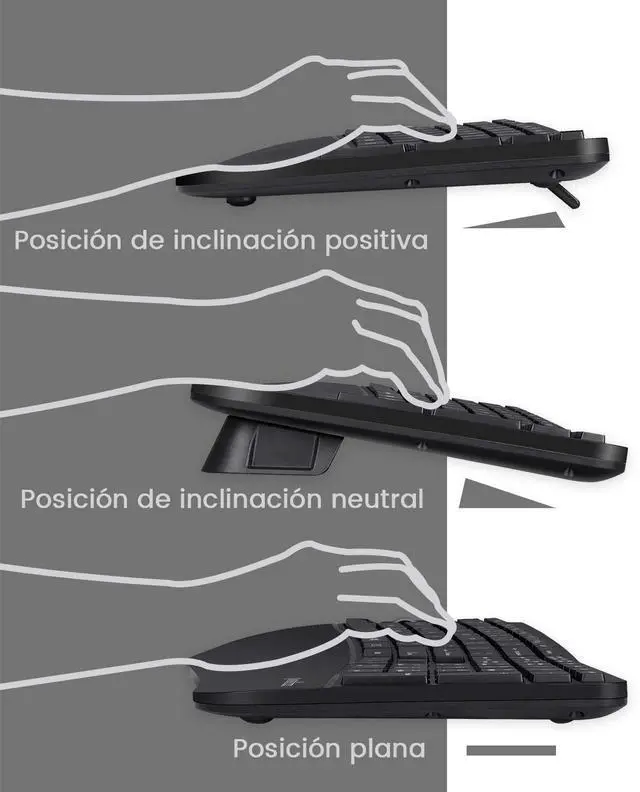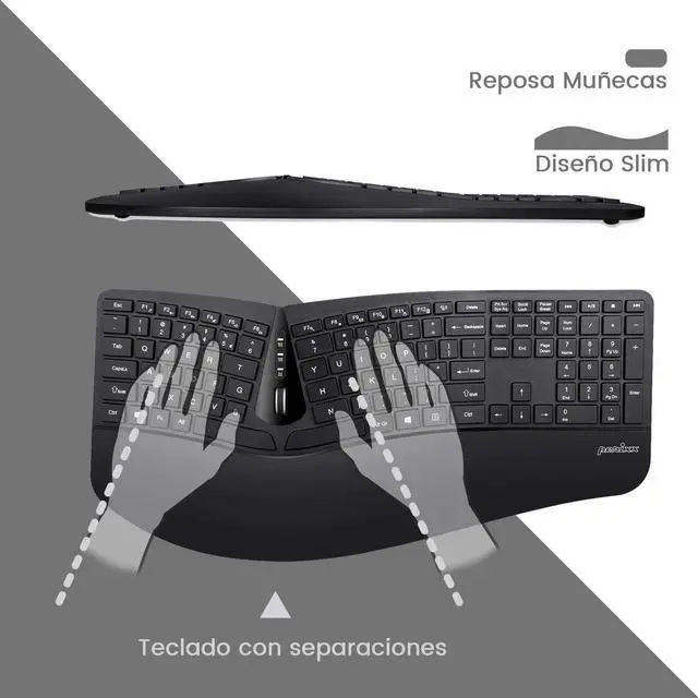Uno: Set disenado especialmente para reducir la presion en las manos durante la realizacion de las tareas, ofrece un tipeo relajado y sin esfuerzo. ^^ Tecnologia inalambrica 2.4 GHz con nano receptor USB 2 en 1; con un alcance de 10 m; El teclado y el raton necesitan 4 Baterias AAA (no incluidas). ^^ Teclado full size con 12 teclas multimedia de acceso rapido, rueda de desplazamiento central hacia 4 direcciones; con diseno curvo y teclado dividido que alivian los problemas del sindrome del canal carpiano y los TMS. Reposa muneca ajustable para una posicion positiva o neutral de la muneca ^^
