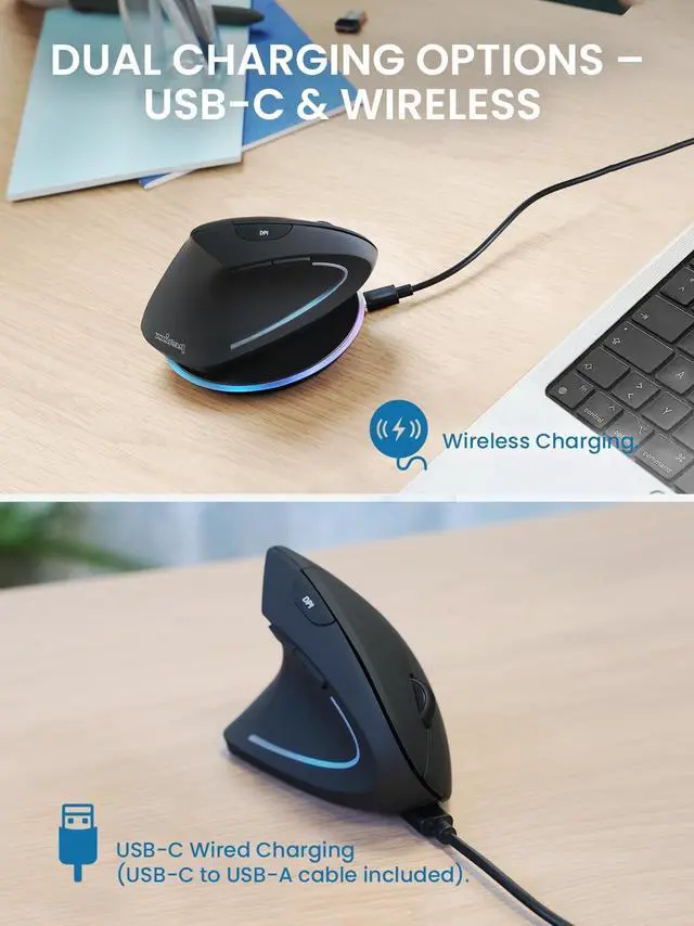 Wireless Ready: PERIMICE-713LR supports USB-C wired charging and is compatible with wireless charging (wireless charging pad not included). Includes USB-C to USB-A cable for convenient wired charging. ^^ Fast & Efficient