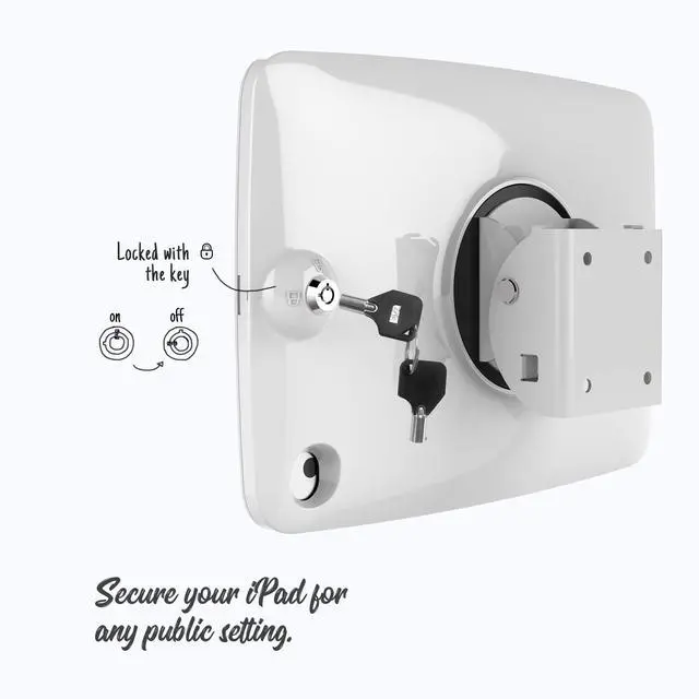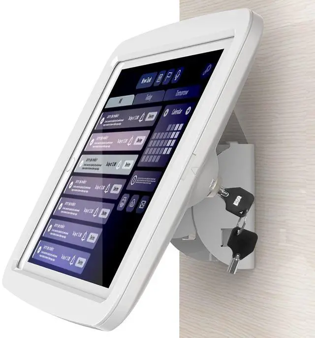Build your own tablet wall mount display This tablet wall mount has wide applications, great for any public setting like conference rooms, warehouse management system, library, gym, trade shows and commercial stores. ^^ Solid secure & appealing This tablet wall mount is theft proof and locked with the key. The bezel of the mount is ABS plastic, light weight and appealing. The bracket is made of steel, mounted to the wall with 4 screws for a long last & solid solution. ^^ Tilt 30 up and down The hinge between tablet mount and wall is adjustable, allowing you to find your ideal viewing angle.
