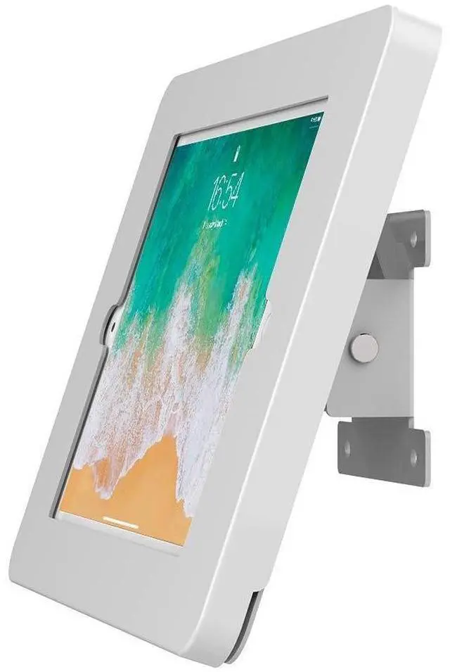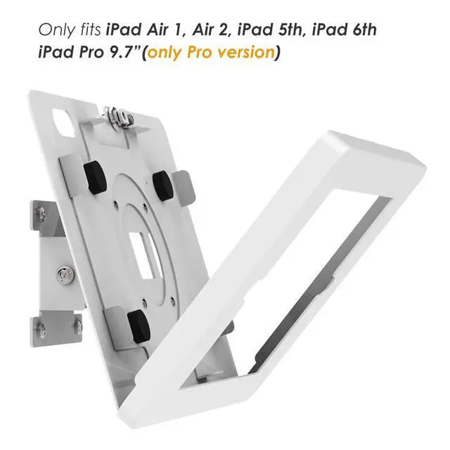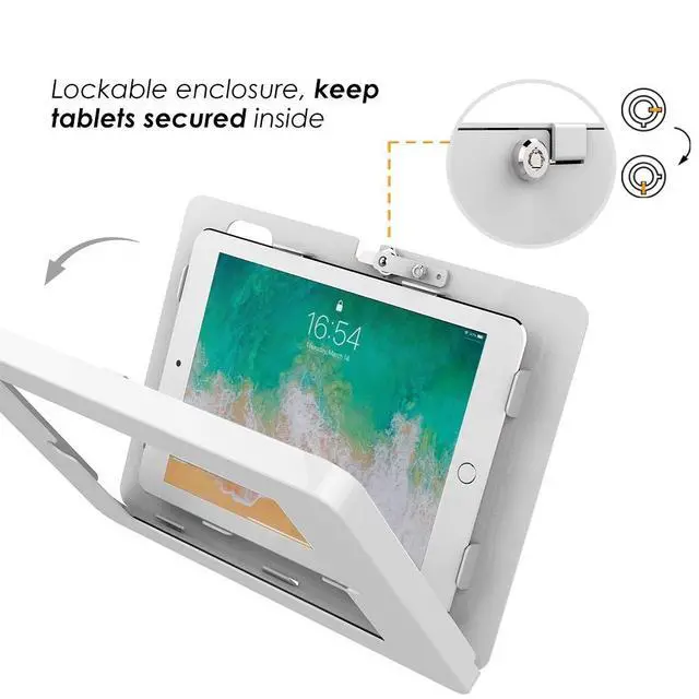STURDY CONSTRUCTION - Made of thick guage cold rolled steel, strong and durable. Can't fit 10.2 iPad 7 (2019). ^^ ANTI THEFT - Lockable enclosure, keep tablets secured inside. A secure tablet wall mount for a public location. ^^ MULTI-ANGLE - Allows landscape or portrait device mounting and the enclosure can be tilted 30. ^^ BUTTON ACCESS - Access to home button, front camera and side volume buttons ^^ Good to use for a visitor check for your office, employees room, conference room. Also customers could use to register and browse different areas of the client website.
