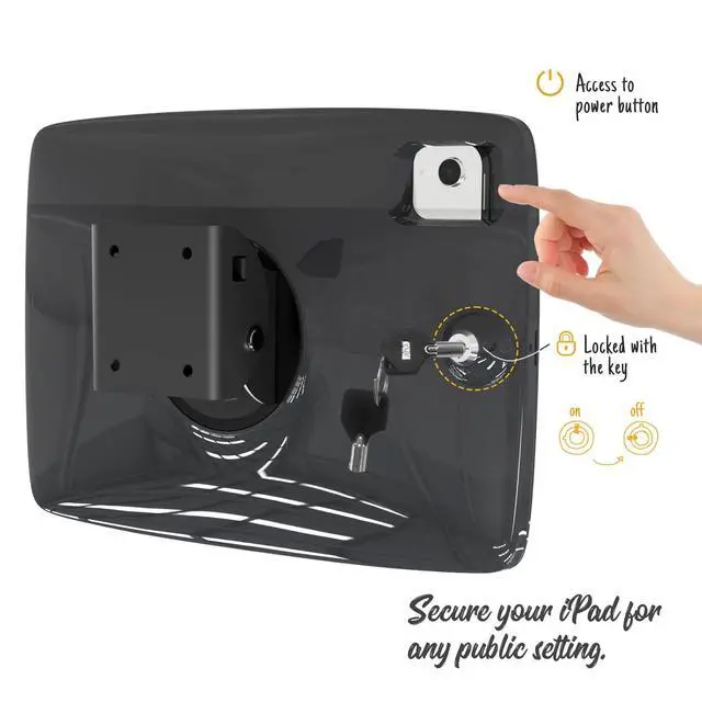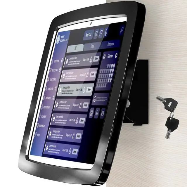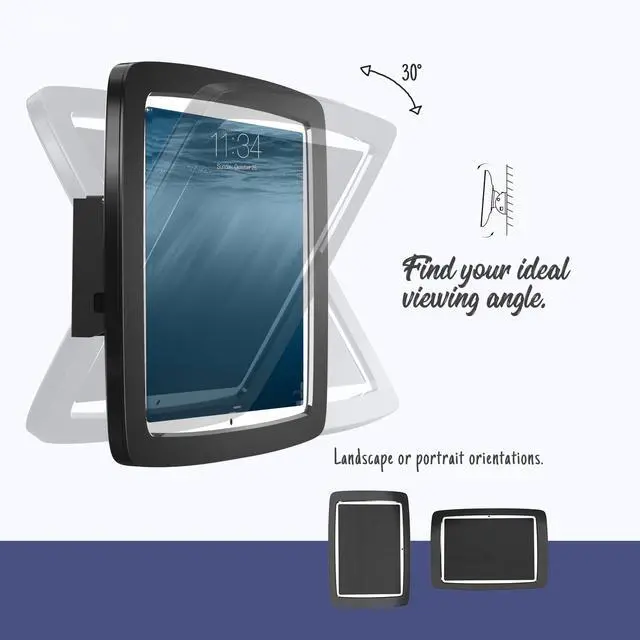 Build your own tablet wall mount display This tablet wall mount has wide applications, great for any public setting like conference rooms, warehouse management system, library, gym, trade shows and commercial stores. ^^ Solid secure & appealing This tablet wall mount is theft proof and locked with the key. The bezel of the mount is ABS plastic, light weight and appealing. The bracket is made of steel, mounted to the wall with 4 screws for a long last & solid solution. ^^ Tilt 30 up and down The hinge between tablet mount and wall is adjustable, allowing you to find your ideal viewing angle.