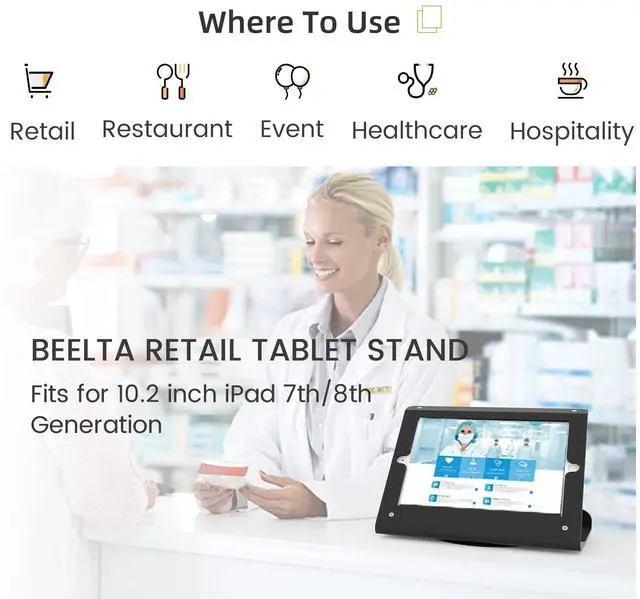 Beelta tablet stand Make your own tablet kiosk. It's made of durable metal, simple stylish ipad counter stand, silicone pad for protection. Suitable for your Coffee Shops, Fast Food and Quick Serve Pizza and Delivery Bars and Night Clubs Table Service.
