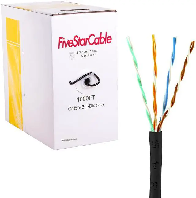 Category 5e Outdoor Solid CCA (Copper Clad Aluminum) 24 AWG UTP Ethernet Cable ^^ 350 Mhz Cat5E Cable Copper clad aluminum wire. 24AWG. Meet Cat5e Standard. Black Color Jacket ^^ Foot-marked cable is packaged in an reel box for easier installation ^^ Cat 5 is also used to carry other signals such as telephony and video. Cat5e Standard. A Category 5 Ethernet cable, commonly referred to as Cat 5, is a twisted pair cable for carrying signals. This type of cable is used in structured cabling for computer networks such as Ethernet.