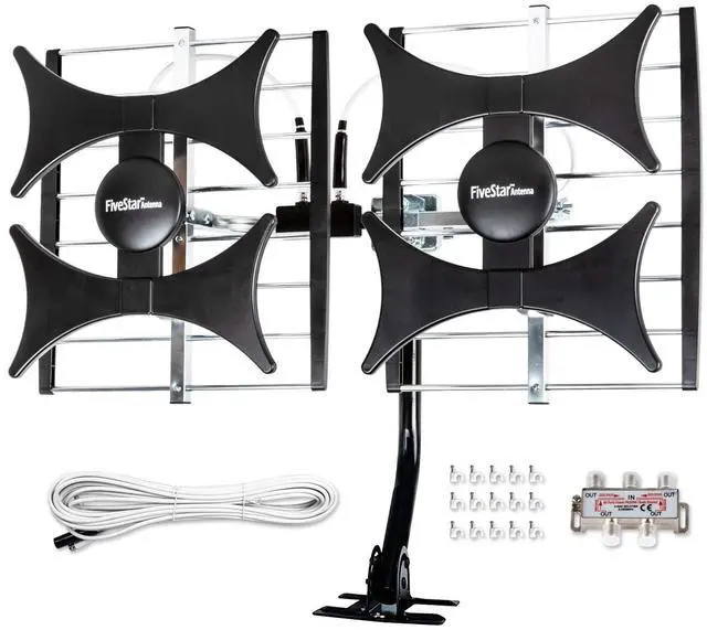 Package included: Five Star multi-directional TV antenna, 40ft RG6 coax cable, Mounting Pole. Freely mount our Five Star antenna with the pole on roof, attic, chimney, eave, mast or outside the house with or without line of sight. Antenna has pre-assembled for some parts. Fully assembly required. ---100% Customer Satisfaction Contact Seller or Support for questions and troubleshooting. ^^ Best gift for parents and family members for Thanksgiving, Christmas and New Year.