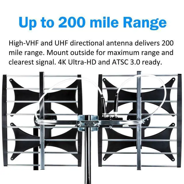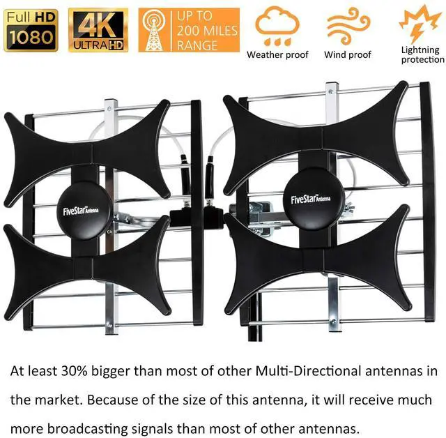 [NEW MULTI-DIRECTIONAL OUTDOOR ANTENNA] Enjoy FREE local HD Channels and without cable bills. Outdoor antenna receives 4K, 1080P, 1080i, 720p HD Channels as local news, ABC, CBS, NBC, PBC, Fox, sitcoms, kids, sports programs and SO MUCH MORE. Cut the cable and with this powerful outdoor antenna, you can save now and No Cable, No Problem. ^^ [ENHANCED SIGNAL RECEPTION] Multi-directional elements deliver range and reception in less than ideal locations. Antenna can pick up VHF and UHF Channels. With this booster technology it allows to reach signal as far as 200 miles (depends on your distance from nearest signal tower, the obstructions between your house and signal tower), and meanwhile reducing the signal noise interference.