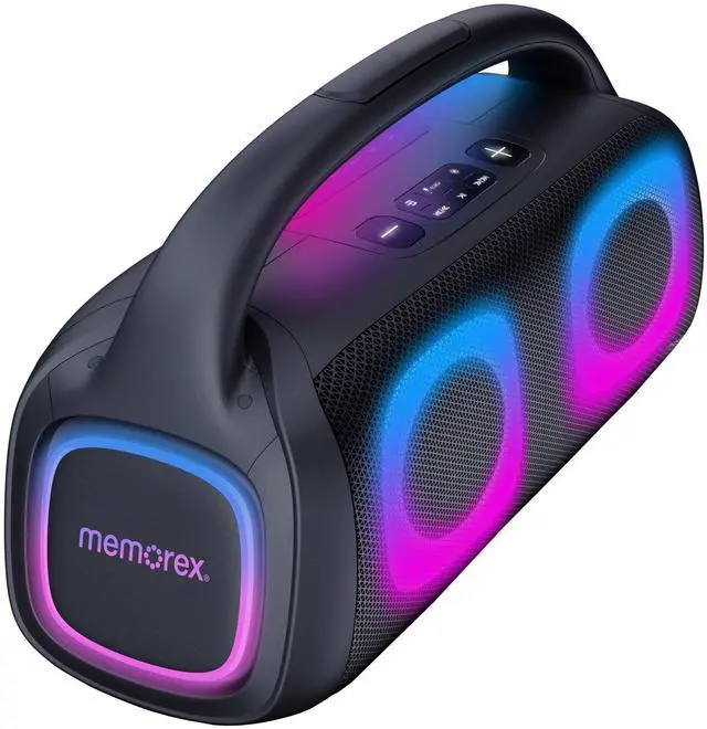 Experience Powerful Sound & Stunning Visuals with the Memorex MX-BTS300 Pump Box Bluetooth Speaker! Designed for music lovers and party enthusiasts, the Memorex MX-BTS300 Pump Box offers powerful 20W sound output, vibrant RGB lighting effects, and multiple playback options to keep the music going wherever you are. Whether you're hosting a party, relaxing at home, or enjoying an outdoor adventure, this rechargeable Bluetooth speaker is built to deliver an immersive audio experience. IMMERSIVE 20W AUDIO PERFORMANCEWith dual 5" speakers delivering 10W x 2 output, this speaker produces deep bass, clear mids, and crisp highs.