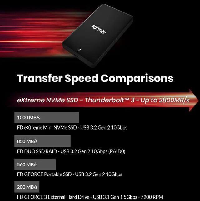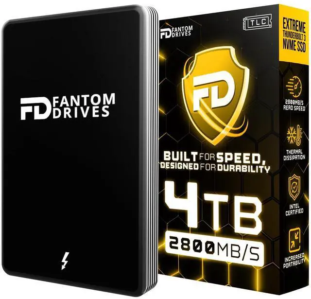 Fantom Drives eXtreme Thunderbolt 3 Portable NVMe SSD is the latest innovation in the data storage market using cutting-edge Thunderbolt 3 technology by Intel. With read speeds up to 2, 800MB/s and write speeds up to 2, 300MB/s, eXtreme Portable NVMe is designed for Mac enthusiasts and production-level creative professionals that value quality, performance, and reliability. eXtreme is backward compatible with the USB 3.2 Gen 2 Type-C port and get 1050MB/s read and write. Built with high-quality aluminum, FD eXtreme is strong and durable for everyday use. The Thermal Dissipation Technology allows heat from the NVMe to be transferred to a thermal pad and then dissipated to each grooved edge of eXtreme.