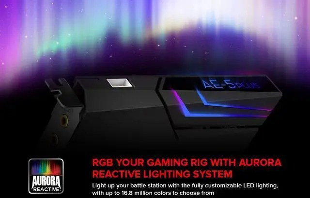 SUPPORTS DOLBY DIGITAL AND DTS Now with support for Dolby Digital Live and DTS Encoding for even more delivery options to your external audio devices The AE-5 Plus also supports 5.1 discrete and 7.1 virtual surround, as well as Sound Blasters Surround Virtualization technology ^^ POWERFUL DISCRETE HEADPHONE AMP Sound BlasterX AE-5 Plus features Xamp, our custom-designed discrete headphone amp that utilizes bi-amplification technology to power each earcup individually with 1 ohm output impedance and drives studio-grade headphones of up to 600, including high-end planar-magnetic headphones ^^ PRISTINE AUDIO QUALITY Featuring the SABRE32 ultra-class PCI-e DAC to deliver up to 32-bit / 384 kHz playback with a 122 dB DNR, ultra-low distortion and jitter, the AE-5 Plus is more than capable of hi-res audio for games, music, and movies; put simply, for discerning audio lovers of any kind, the AE-5 Plus is set to blow past your expectations with pristine audio and powerful performance ^^ RGB YOUR GAMING RIG The AE-5 Plus has customizable RGB LEDs on its body, and also features an included RGB LED strip.
