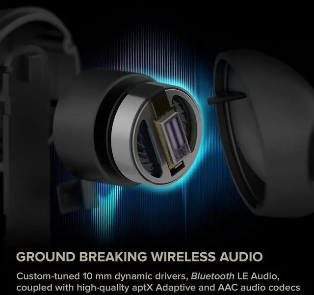 POWERED BY xMEMS DRIVERS - Enjoy a rich, detailed sound profile across all genres, from booming bass to crisp highs. Coupled with high-quality aptX Adaptive audio codecs, the Creative Aurvana Ace deliver great audio performance on the go ^^ UNINTERRUPTED AUDIO STREAMING - the next-generation Bluetooth LE Audio offers exceptional wireless audio quality with lower bitrates and power consumption, delivering a more immersive high-definition listening experience ^^ NOISE CONTROL FEATURES Tune out with Hybrid Active Noise Cancellation (ANC), allowing you to enjoy your music without interference. Tune in with Ambient mode lets you connect to the world around you ^^ LONG BATTERY LIFE - Comes with a battery life of up to 24 hours total playtime, 6 hours on a single charge, and recharge via the included USB-C cable ^^ BE HEARD CLEARLY - Featuring a total of six built-in microphones and powered by Qualcomm cVc (Clear Voice capture) noise cancellation technology, these integrated mics ensure crystal clear voice calls
