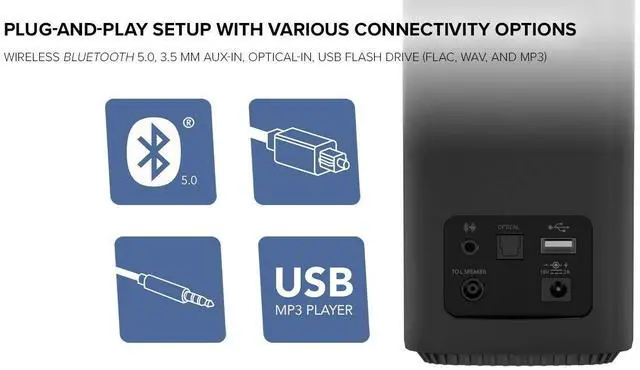 MINIMALISTIC 2.0 COMPUTER SPEAKERS - Elegant and minimalistic design that fits into any desktop setting. Perfect for desktop computers and laptops with limited tabletop space ^^ SIMPLE SETUP WITH MULTIPLE CONNECTIVITY OPTIONS - Simply connect T100 via a myriad of connectivity options such as wireless Bluetooth 5.0, 3.5 mm AUX-in, Optical-in for PS4 Pro, and USB flash drives (supports FLAC for hi-res lossless audio, WMA, and MP3 formats) ^^ WIDE SOUNDSTAGE AND SUPERIOR AUDIO CLARITY - Specially tuned to bring out a truly immersive and room-filling audio experience, enjoy wide, lifelike soundstage with incredible depth and audio clarity.