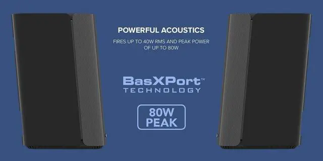 Our proprietary BasXPort technology further enhances the bass for rich, deep tones without the need for a subwoofer ^^ POWERFUL 40W RMS DIGITAL AMPLIFIER - Furnished with 2.75 full-range drivers with built-in digital amplifier that fires up to 40W RMS and peak power of up to 80W. Enjoy detailed vocals and catch details that you have been missing before ^^ EQ PRESETS WITH ADJUSTABLE BASS AND TREBLE VIA REMOTE CONTROL - Further adjust your audio with the included remote control. Apart from the EQ presets for movies, music, concert, and gaming modes, you can also increase and reduce treble and bass settings to your liking