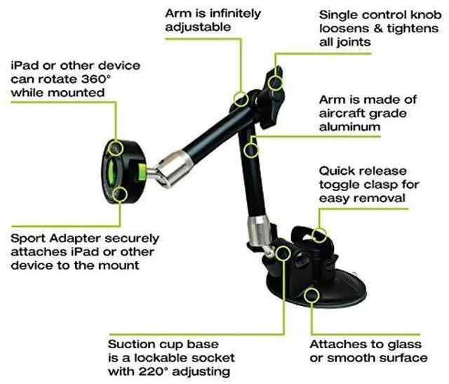 INFINITELY ARTICULATING AND ADJUSTABLE: The ball and socket end joints and ratcheting center make the arm adjustable to any position, creating the perfect heads up viewing of your device. The arm has three independent joints, all adjustable and lockable from the single, centrally located, control knob. The suction cup attachment is a separate lockable joint. You are no longer limited to a fixed length or a limited rotation. The mount is extendable to 10.5" and retracts to as little as 3.25