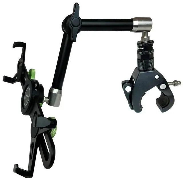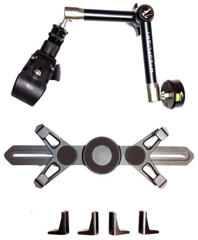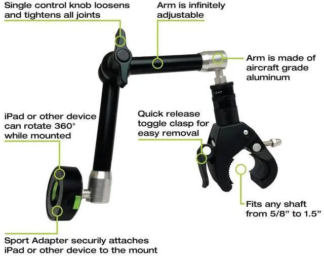 INFINITELY ARTICULATING AND ADJUSTABLE: The ball and socket end joints and ratcheting center make the arm adjustable to any position, creating the perfect heads up viewing of your device. The arm has three independent joints, all adjustable and lockable from the single, centrally located, control knob. The clip attachment is a separate lockable joint. You are no longer limited to a fixed length or a limited rotation. The mount is extendable to 14 and retracts to as little as 1. ^^ HEAVY-DUTY WHILE BEING COMPACT AND LIGHT-WEIGHT: The aircraft-grade aluminum and stainless steel construction of the mount and cradle provides a rocksteady, vibration-free platform for your iPad, iPhone, phone, tablet, GPS, camera, ELD, or other device. Shock tested and certified to hold up to a force of 20 Gs. When removed, the mount is portable and can easily fit into your flight bag as it only weighs 13.7 oz., while the cradle is only 4 oz.