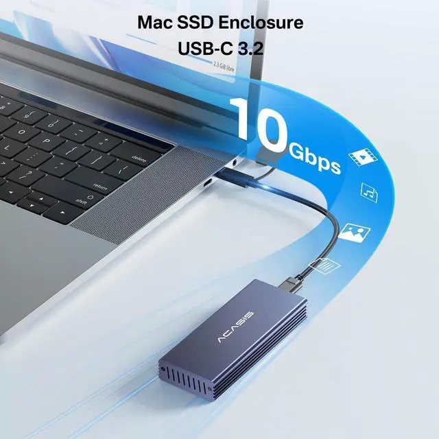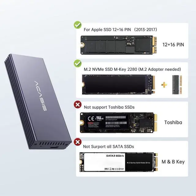 [Higher Compatibility] This USB C 3.2 SSD enclosure works well for Apple original Mac SSDs with 12+16 Pins. It comes with a M. 2 NVME SSD adapter make it also support m. 2 2280 NVME SSDs. DOES NOT support Toshiba 12+16 PIN SSDs (*please make sure your SSD in Mac is not a Toshiba one before purchase). NOT compatible with all SATA SSDs, or third-party SSDs. ^^ [Faster Data Transmission] 10Gbps transmission speed with USB 3.2 Gen2 interface. Save and transfer data in a seconds. It can also reach 20Gbps transmission speed with USB 3.2 Gen2x2 if the computer supports.