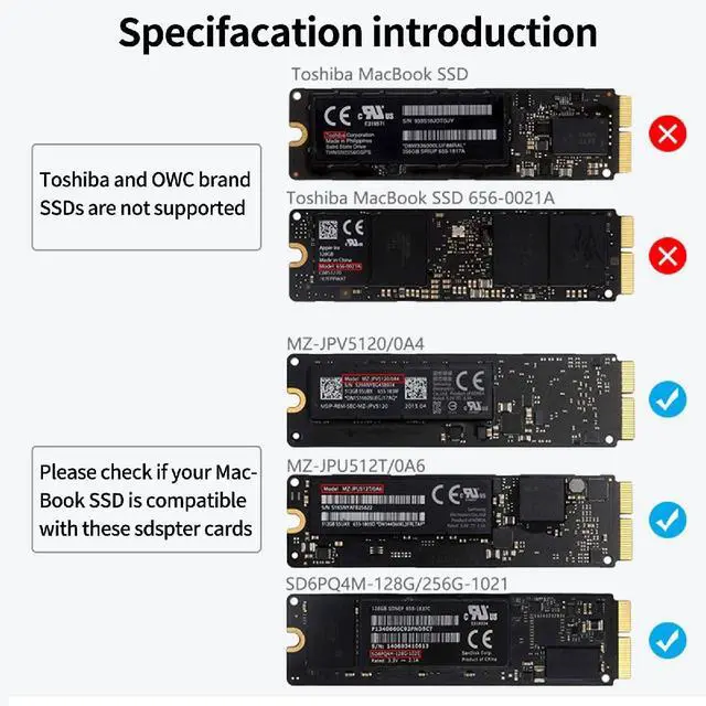 [Only Support Narrow Mac SSDs]This USB C 3.0 SSD enclosure enclosure only support narrow Mac SSDs, not support wide Mac SSDs. This USB C 3.0 SSD enclosure works well for Apple original Mac SSDs with 6+12 Pins. DOES NOT support Toshiba 12+16 PIN SSDs (*Please make sure your SSD in Mac is not a Toshiba one before purchase). NOT compatible with all SATA SSDs, or third-party SSDs. Support M. 2 NVMe SSDs with an enclosure interface adapter. ^^ [System Requirements] ACASIS USB C 3.0 SSD enclosure supports Windows7/8/10/11, Mac OS 10.0, Linux 2.6 or later.