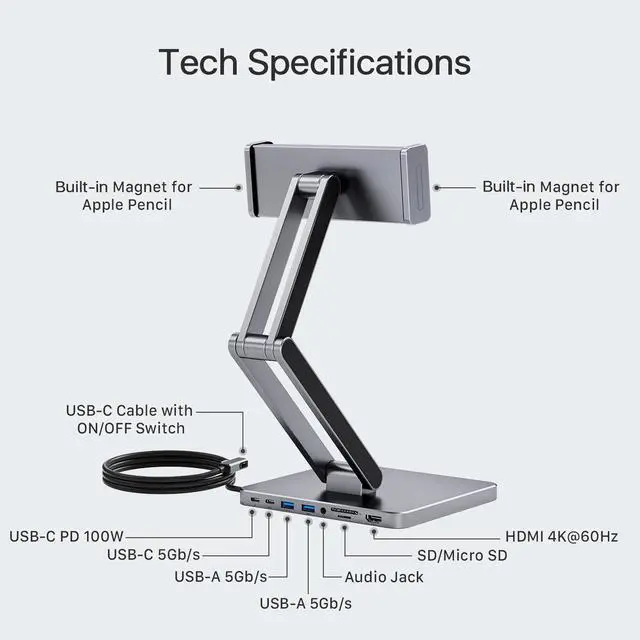 INVZI MagHub 8-in-1 Docking Station for iPad Pro and Android Tablets, USB C Hub Stand with Adjustable Dual-Hinge, Compatible with M2/M1/M4 iPad Pro/Air, 10th, Mini 6th, Samsung Galaxy, Pixel Tabs