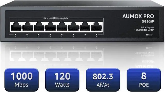 [(120W poe switch)] AUMOX PRO network switch equipped with 8 802.3af/at PoE ports with up to 30W for each port, data, and power can be transferred on one single cable.It supports PoE power up to 120W for all PoE ports.