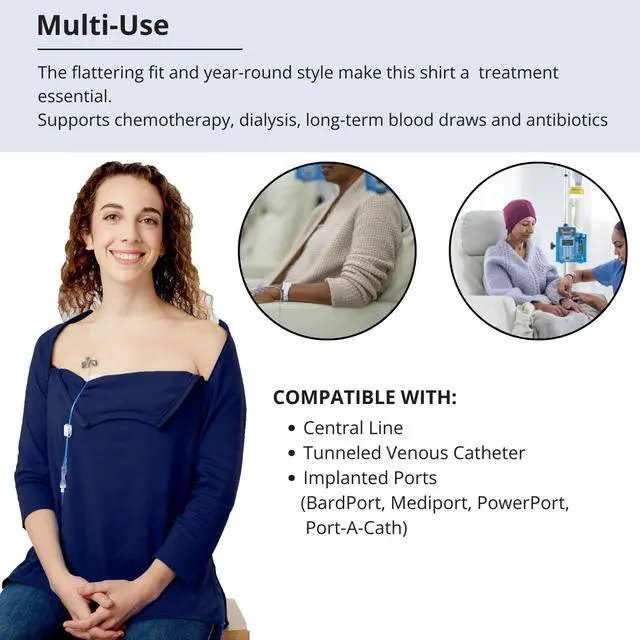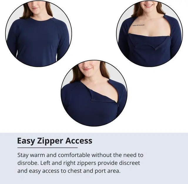 With its universally flattering fit and year-round style, the Care+Wear (tm) Dual Port Access Shirt keeps you warm and comfortable, while discreetly providing easy and convenient clinical access to your chest & port area during chemotherapy and other treatments, making this top a treatment essential and great gift. Stay super comfortable in this dual zipper opening chest access shirt. Ideal for chemo & other long-term IV therapies. Compatible with central line, tunneled venous catheter, implanted port or port-a-cath devices