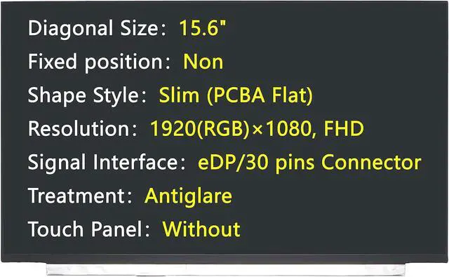 • Diagonal Size:15.6"; Fixed position:Non; Shape Style:Slim (PCBA Flat); Resolution:1920(RGB)x1080, FHD; Signal Interface:eDP/30 pins Connector; Treatment:Antiglare; Touch Panel:Without;